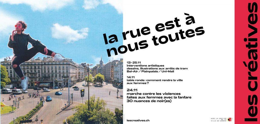 Enfin, le 24 novembre ce projet se clôturera par un grand rassemblement public et une marche dans les rues du centre ville de Genève, menée par la fanfare afro-féministe «30 nuances de noir(es)», pour marquer la Journée internationale contre les violences faites aux femmes et en écho aux rassemblements prévus à Paris et dans plusieurs villes européennes. Le rassemblement est fixé à 15h sur l’esplanade d’Uni Mail. La marche longera la plaine de Plainpalais pour rejoindre les rues basses. Des personnalités telles que l’essayiste Mona Chollet, l’humoriste Marina Rollman et la journaliste Lauren Bastide se joindront à ce mouvement. Les réseaux sociaux seront mobilisés avec les hastag #NousToutes et #jemarchele24ageneve.
